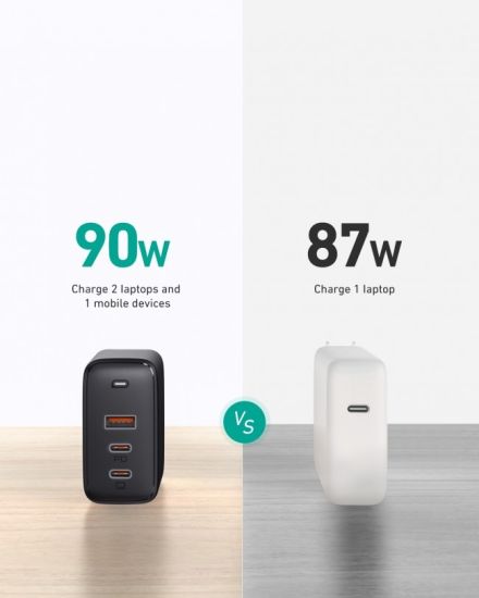 Deze Aukey adapter biedt 90W Power Delivery 3.0 opladen via één USB-C poort om bijvoorbeeld uw Macbook Pro op volle snelheid op te laden. Daarnaast kunnen iPhones vanaf de iPhone 8 snel worden opgeladen met Power Delivery. De Samsung Galaxy Note 20, of S21 Ultra worden met gemak opgeladen via de 45W USB-A poort.