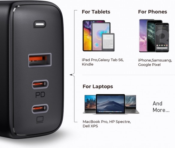 De lader werkt met bijna alle USB-C laptops, en apparaten die beschikken over de PD functie. Onder deze apparaten behoren bijvoorbeeld: MacBook Pro 16 ", MacBook Air, iPhone 12/12 Pro / 11 Pro Max / SE, Samsung S21 + / NOTE 20+, Google Pixel 4/3 XL, LG G7 / V50, AirPods Pro, Switch, iPad Pro 2020, iPad Air 2020, iPad mini 2020, Airpods Pro en veel meer.